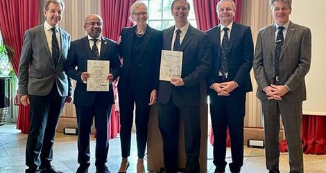 Mr. Satish Kutty, 2.v.l. und Prof. Brian Mullis, 4.v.l. bei der Übergabe der Urkunden in Baden-Baden gemeinsam mit (von links) Prof. Reinhard Windhager, Verantwortlicher der ÖGOuT für das Fellowship in Österreich, Prof. Anke Eckardt, Fellowsekretär, Prof. Heiko Reichel, Vorsitzender der Stipendienkommission und Prof. Jose Romero, Verantwortlicher der Swiss Orthopedics für das Fellowship in der Schweiz